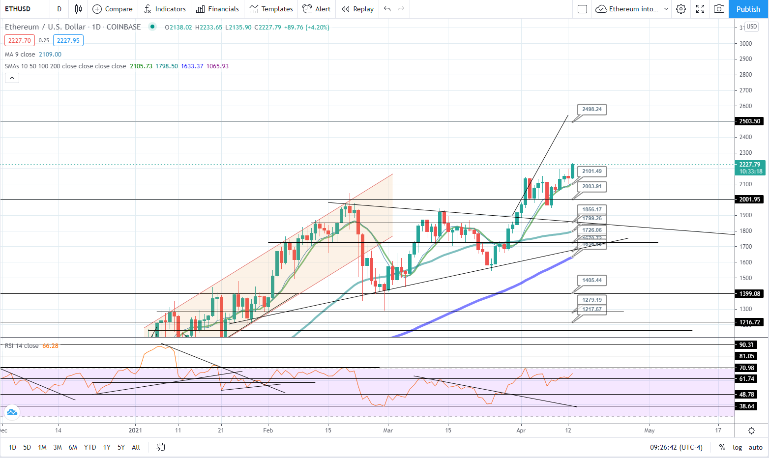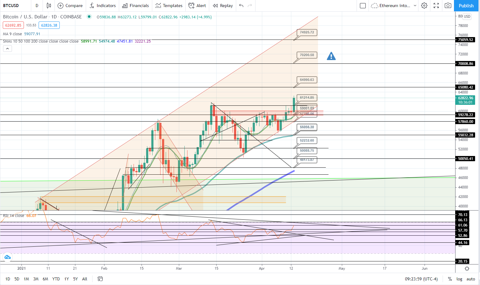Here is the daily bitcoin chart. We finally broke all time high and have now entered “price discovery mode” once again. The RSI looks good here with a solid pop overnight gaining about 3k in value. Our next targets should be 65k as well as 70k. I’m leaning toward the RSI running toward 70k. We will then find out how much of a resistance that level can be.