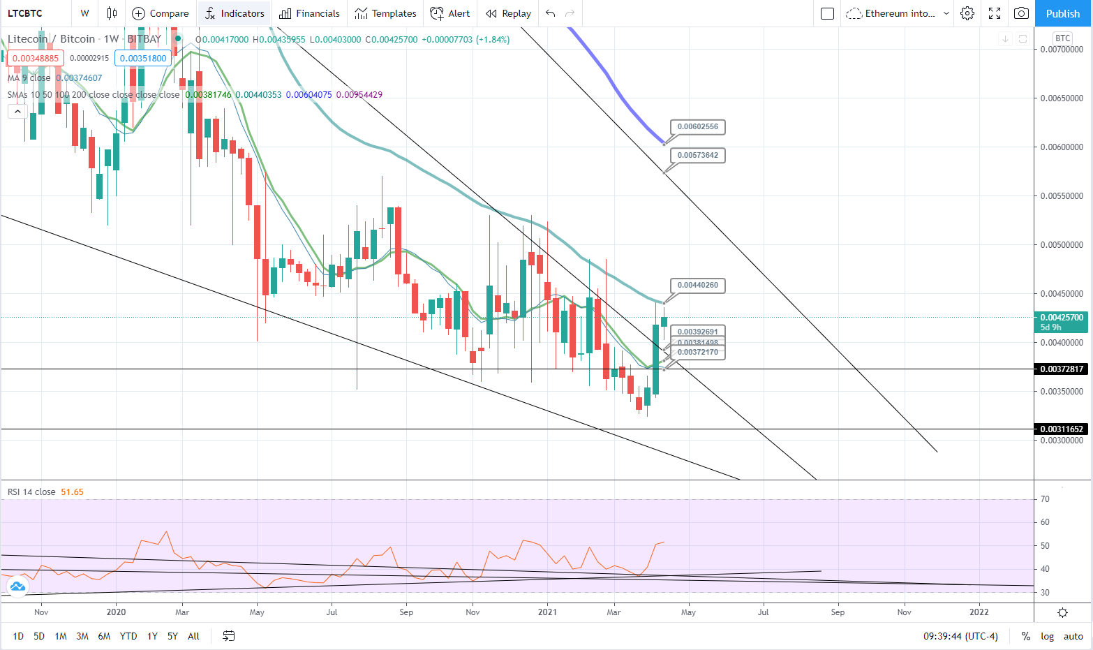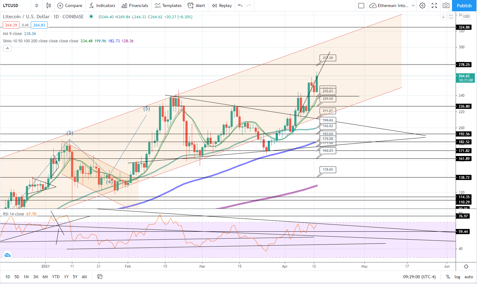 Litecoin looks close to ethereum in the sense that it broke upward out of a pennant then successfully backetested. Our measured move takes us to 277 but I'm keeping my eye on the prize at the 325 price point. If the RSI can break upward it will run hard before a pullback. I expect the 325 area to be the touger of the resistance levels.