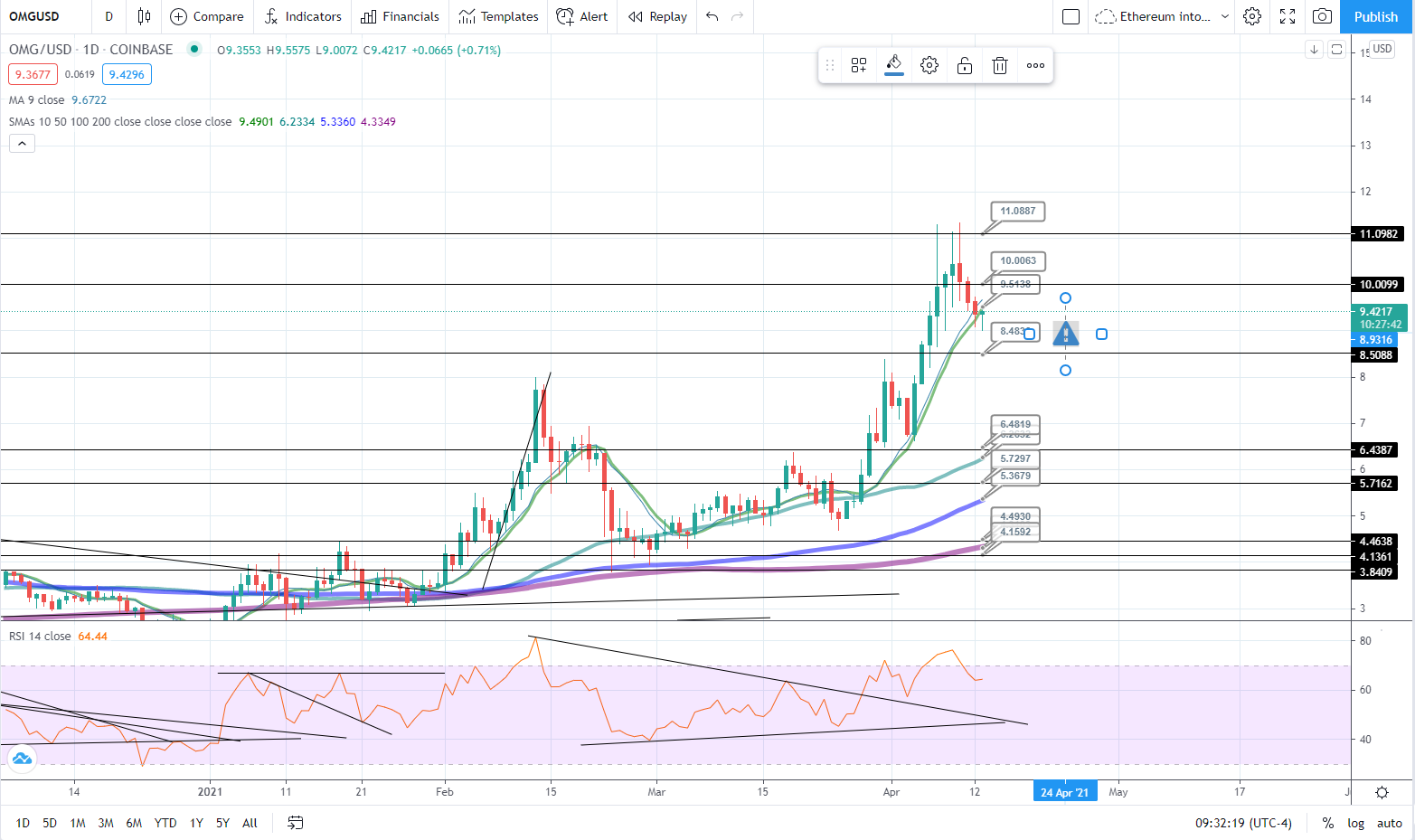 OMG is very volatile but insanely bullish still. My last update I said i would have covered to protect my gains. It’s pulling back and something well timed can certainly be lucrative. Any price near the 8.48 mark I really like for entry. Then off to another test of ATH around $11. Be patient with this trade. A well timed scalp could land you 30%.
