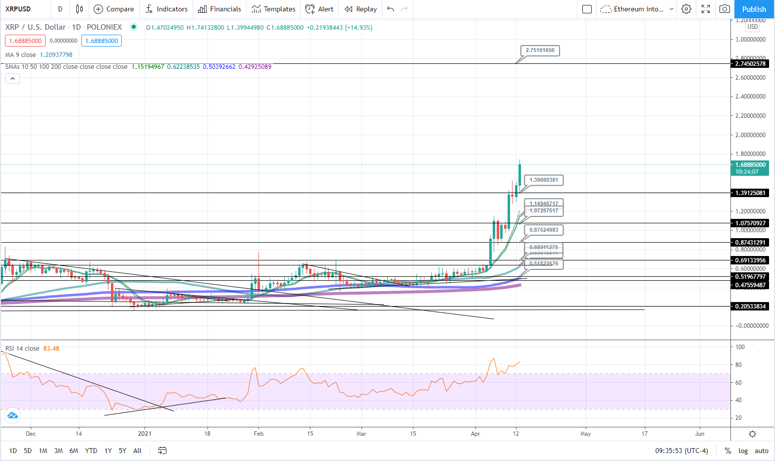 XRP has absolutely shocked me from its humble roots around .20 to rip all the way over $1 dollar. The RSI is totally cooked and I expect a decent size pullback (or backtest) of the 1.40 region before ripping again. If it continues behaving like this, 2.75 will be here before you know it.